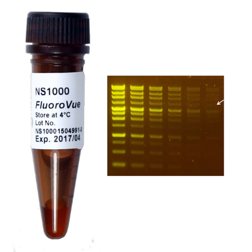 FluoroVue Nucleic Acid Gel Stain (10,000x) is a fluorescent stain specially designed for in-gel use. This stain offers high sensitivity detection of double-stranded or single-stranded DNA and RNA in a convenient manner. FluoroVue Nucleic Acid Gel Stain is a safer replacement for conventional Ethidium bromide (EtBr), which poses a significant health and safety hazard for its user, and has a greater sensitivity as well.
