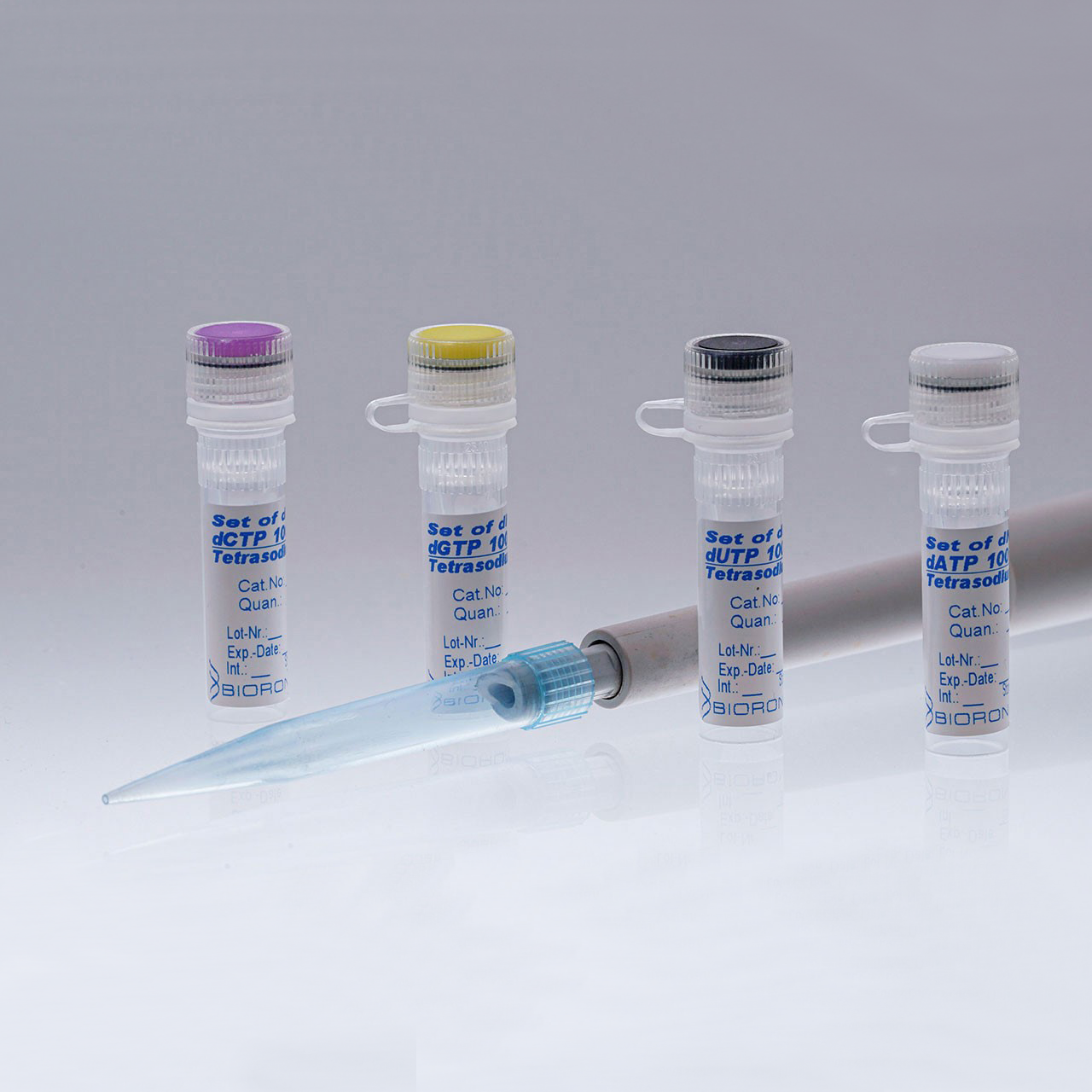 The set consists of 4 x 100 mM aqueous solutions of dATP, dCTP, dGTP and dUTP, each supplied in a separate vial.