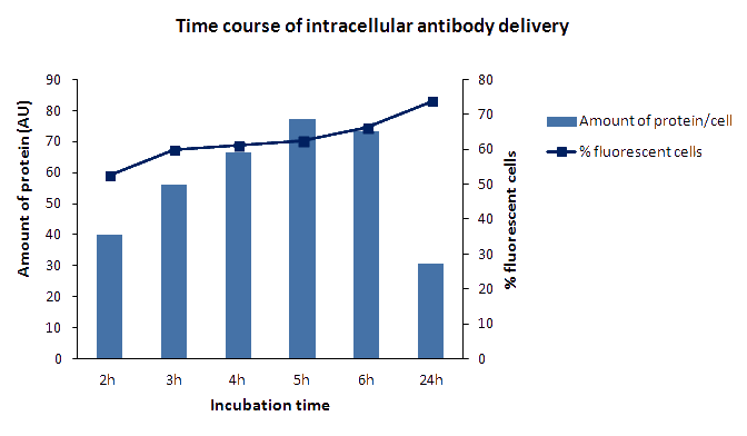 Figure 1: Intracellular delivery of fluorescently labeled IgG into various cells. Fluorescently labeled polyclonal IgG from human serum was delivered into cells seeded in a 24-well plate using 1 µg FITC-IgG and 2 µL Ab-DeliverIN per well. After 24h, cells were fixed and observed under fluorescence microscopy. Left: CHO; middle: BHK-21; right: HEK293.