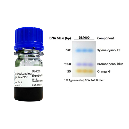 ExcelDye 6x DNA Loading Dye (Tri-Color) is a pre-mixed buffer for tracking DNA samples during electrophoresis on agarose or polyacrylamide gels. It contains three dyes (Xylene cyanol FF, Bromophenol blue, Orange G) for tracking the DNA migration. The Xylene cyanol FF, Bromophenol blue and Orange G migrate at approximately 800 bp, 150 bp and 30 bp on a standard 2% TAE agarose gel respectively (4,000 bp, 500 bp and 50 bp on 1% TAE agarose gel respectively). The included glycerol keeps the DNA at the bottom of the well and the presence of EDTA chelates divalent metal ions to prevent the process of metal-dependent nuclease.