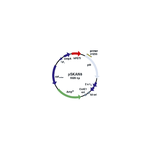 The phagemid pSKAN8 is a phagemid vector used to prepare your own phagemid display library. pSKAN8 encodes an hPSTI-pIII fusion protein, a specific inhibitor of the protease trypsin. pSKAN8 was used for the construction of the pSKAN phagemid libraries HyA, HyB, and HyC found in Mobitec’s pSKAN Phagemid Display System. A protocol is provided for preparation of your own library. This protocol was designed for the presentation of a hypervariable amino acid loop of 6-8 amino acids.